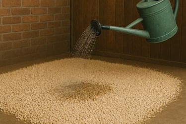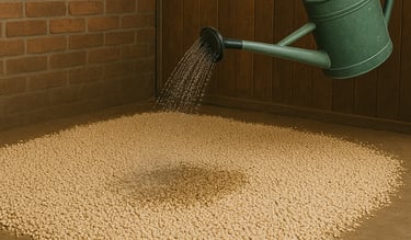 Im nächsten Schritt werden die Pellets leicht angefeuchtet. Dazu eignet sich am besten eine Gießkanne oder ein Wasserschlauch. Durch die Feuchtigkeit quellen die Pellets innerhalb von zwanzig bis dreißig Minuten auf und verwandeln sich in eine lockere, weiche Matratze, die eine angenehme und elastische Liegefläche für das Pferd bietet.