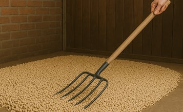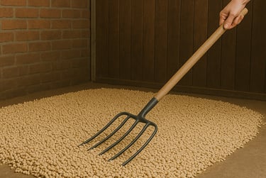 Sobald die Pellets vollständig aufgequollen sind, werden sie mit einer Harke oder Mistgabel gleichmäßig in der Box verteilt. Auf diese Weise entsteht ein gleichmäßiger Untergrund, der komfortabel, federnd und zugleich rutschfest ist.