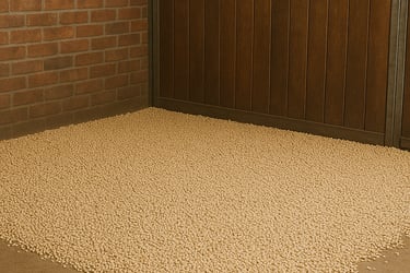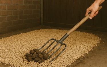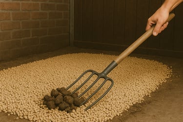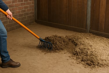 Bevor die Strohpellets eingebracht werden, sollte die Pferdebox gründlich gereinigt werden. Alte Einstreu, Mist und Staubreste sind vollständig zu entfernen, damit der Boden sauber und trocken ist. Nur so können sich die Pellets später gleichmäßig verteilen und ihre volle Wirkung entfalten.