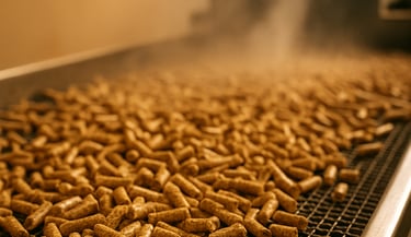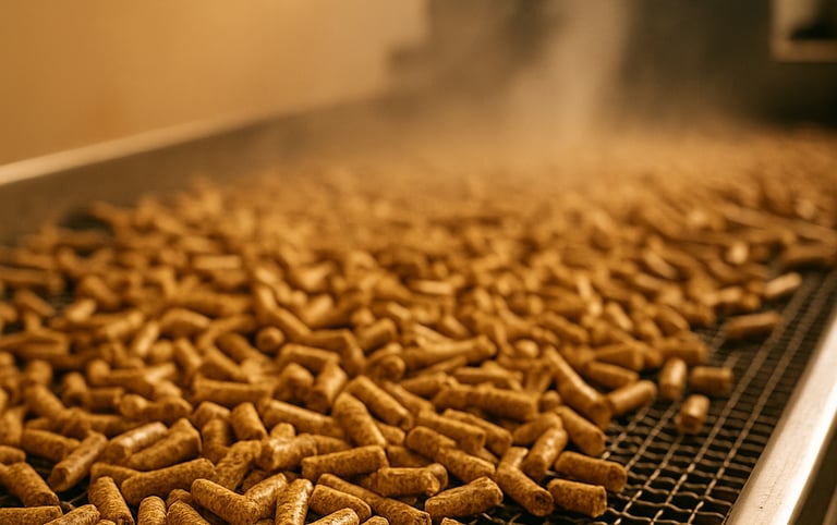 Temperaturkontrolle: Nach der Pelletierung sind die Pellets noch heiß. Sie werden durch einen Kühlprozess abgekühlt, was ihre Haltbarkeit erhöht und sie für den weiteren Transport vorbereitet.
