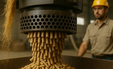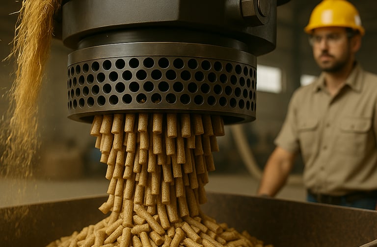 Hoher Druck für perfekte Form: In einer Pelletierungsmaschine wird das zerkleinerte Stroh unter hohem Druck durch Matrizen gepresst. So entstehen die charakteristischen zylindrischen Pellets, die für ihre Dichte und Festigkeit bekannt sind.