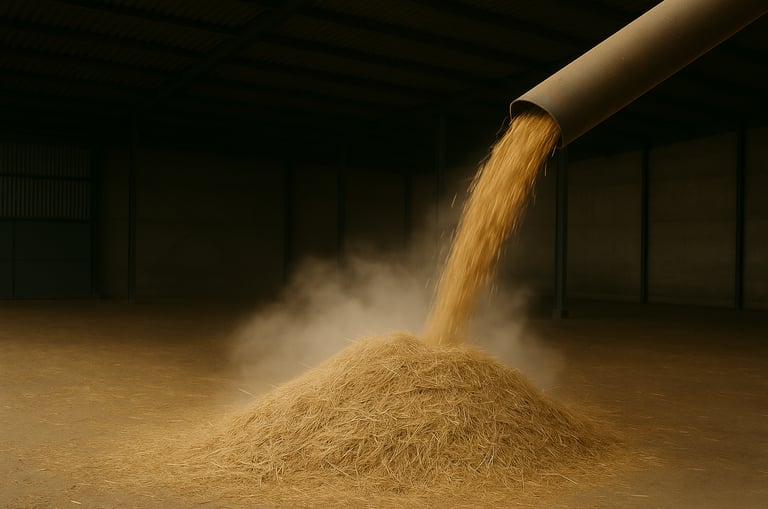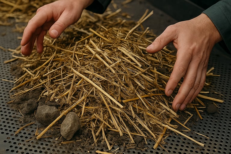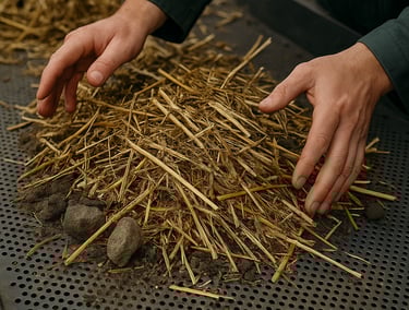 Gründliche Reinigung: Das gesammelte Stroh wird von Verunreinigungen wie Schmutz, Steinen und anderen Fremdstoffen befreit, um eine hohe Qualität der Pellets zu gewährleisten.
