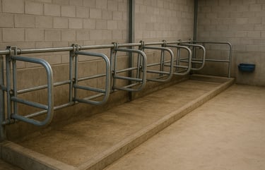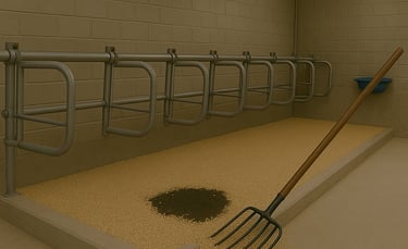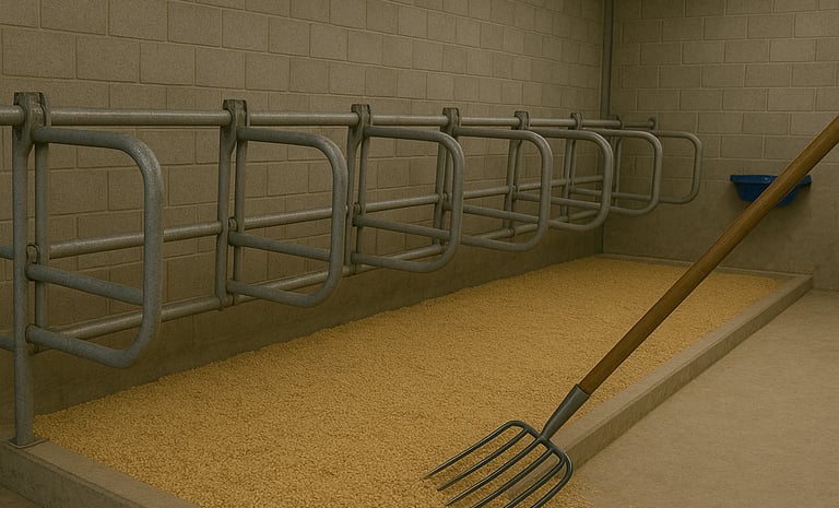 Bevor die Strohpellets eingebracht werden, sollte der Stall gründlich gereinigt werden. Alte Einstreu, Mist und Staubreste sind vollständig zu entfernen, damit der Boden sauber und trocken ist. Nur so können sich die Pellets später gleichmäßig verteilen und ihre volle Wirkung entfalten. Erstell mir bitte für diesen Text ein Bild es geht um ein Rinderstahl