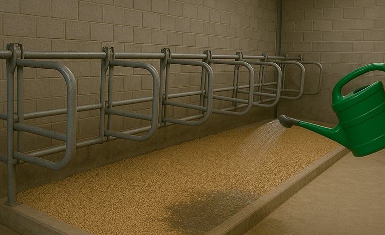 Im nächsten Schritt werden die Pellets leicht angefeuchtet. Am besten eignet sich eine Gießkanne oder ein feiner Wasserstrahl. Durch die Feuchtigkeit quellen die Pellets innerhalb von 20 bis 30 Minuten auf und verwandeln sich in eine lockere, weiche Matratze, die eine angenehme und elastische Liegefläche für die Rinder bildet.